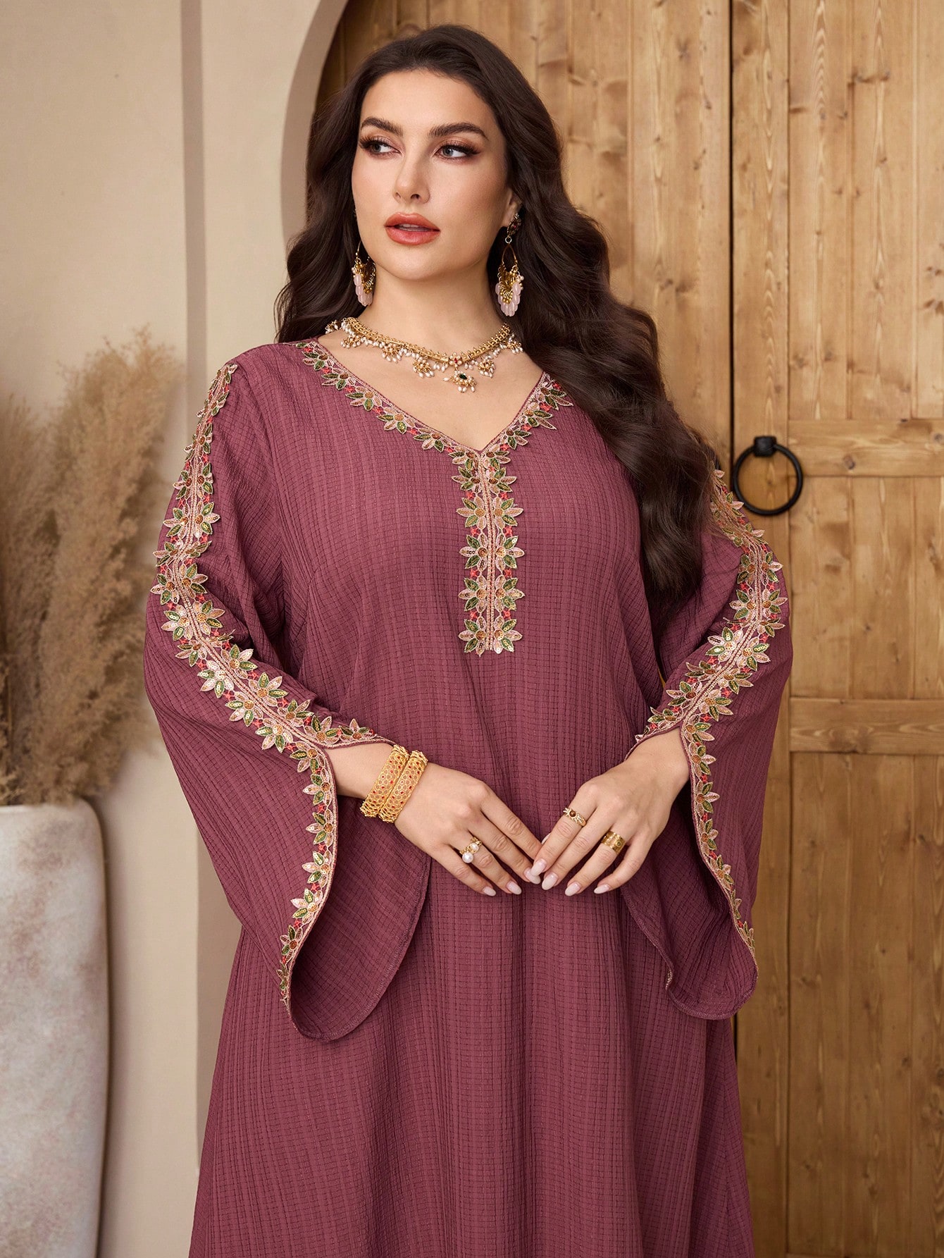 Al Najma رمضان فستان أنيق بأكمام واسعة مطرز بالزهور، موسم الخريف